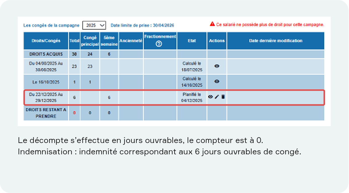 Exemple : si un salarié pose la semaine du 22 décembre avec un retour au travail le 5 janvier, 10 jours de congé lui seront décomptés et non 12, du fait de la présence de deux jours fériés (25 décembre 2025 et 1er janvier 2026).
